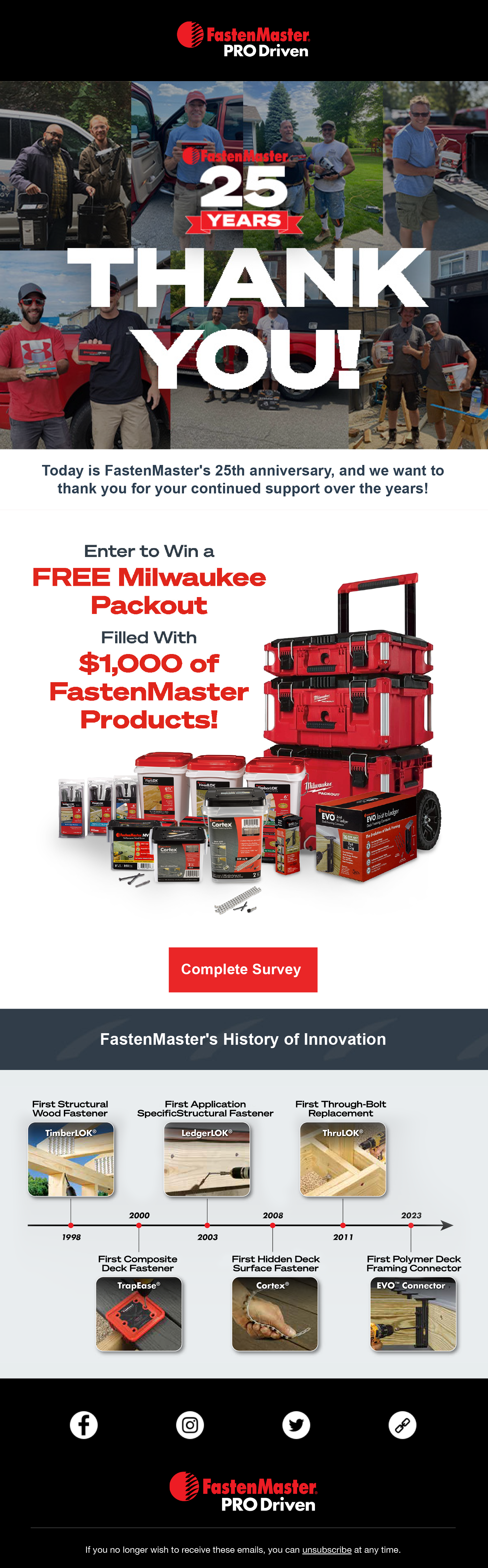 June 2023 was FastenMaster’s 25th anniversary. In order to commemorate this occasion, we launched our FM25 campaign across our digital channels. The goal of this campaign was to position FastenMaster as a leader in innovation and tie our products together under the FastenMaster brand.