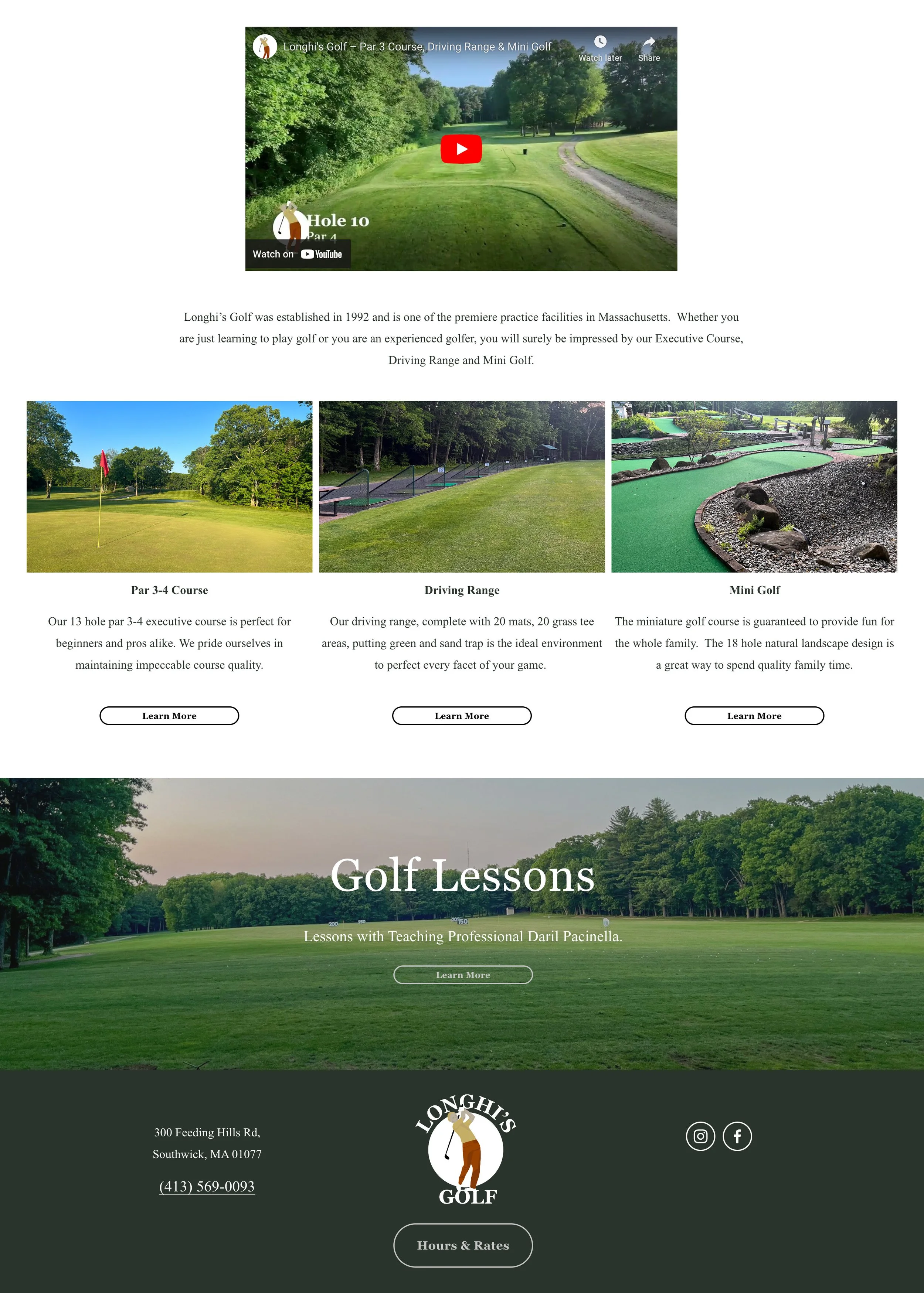 Longhi’s Golf is a 13 hole par 3 (mostly) golf course with mini golf and a driving range in Southwick, MA. The website they had been using previously was very dated and did not do a very good job of showcasing the course. The owner approached me and asked if I could redesign their website and edit a video to be featured on that site.